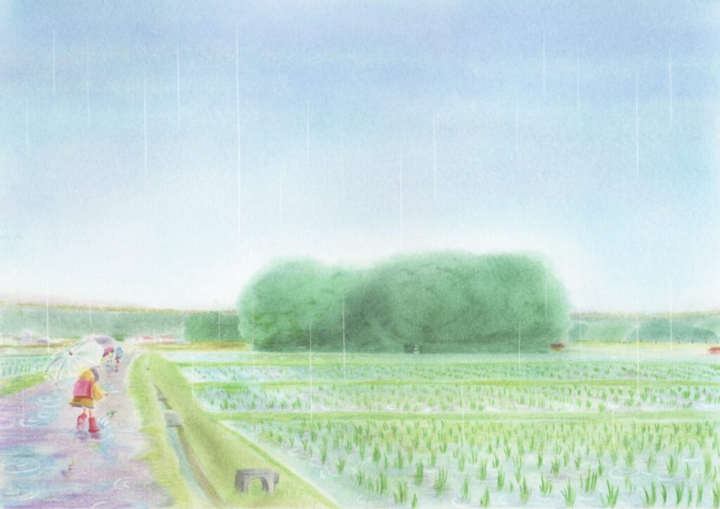 三重県度会郡玉城町(南勢地域、伊勢志摩に含まれる)朽羅神社(くちらじんじゃ)をモデルに製作。田んぼの中にぽつんと立つ森が不思議な雰囲気を感じる地です。雨の日の学校の帰り道のわくわく感をイメージしました。